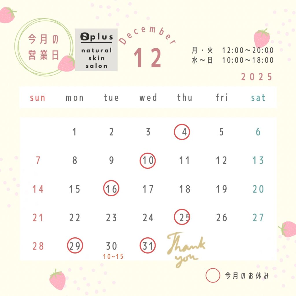 慌ただしい月ですが、クリスマス前や年明け前お肌のケアも予定に入れましょう。12月も皆さまにお会い出来ますことを楽しみにお待ちしております。